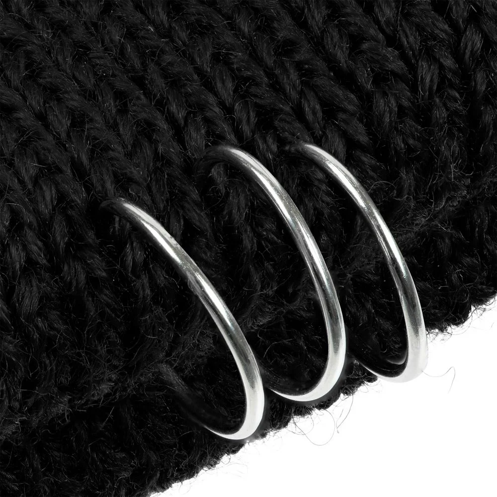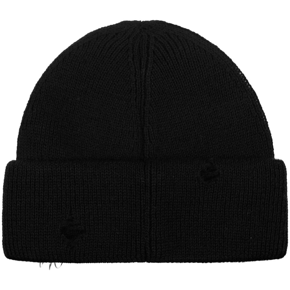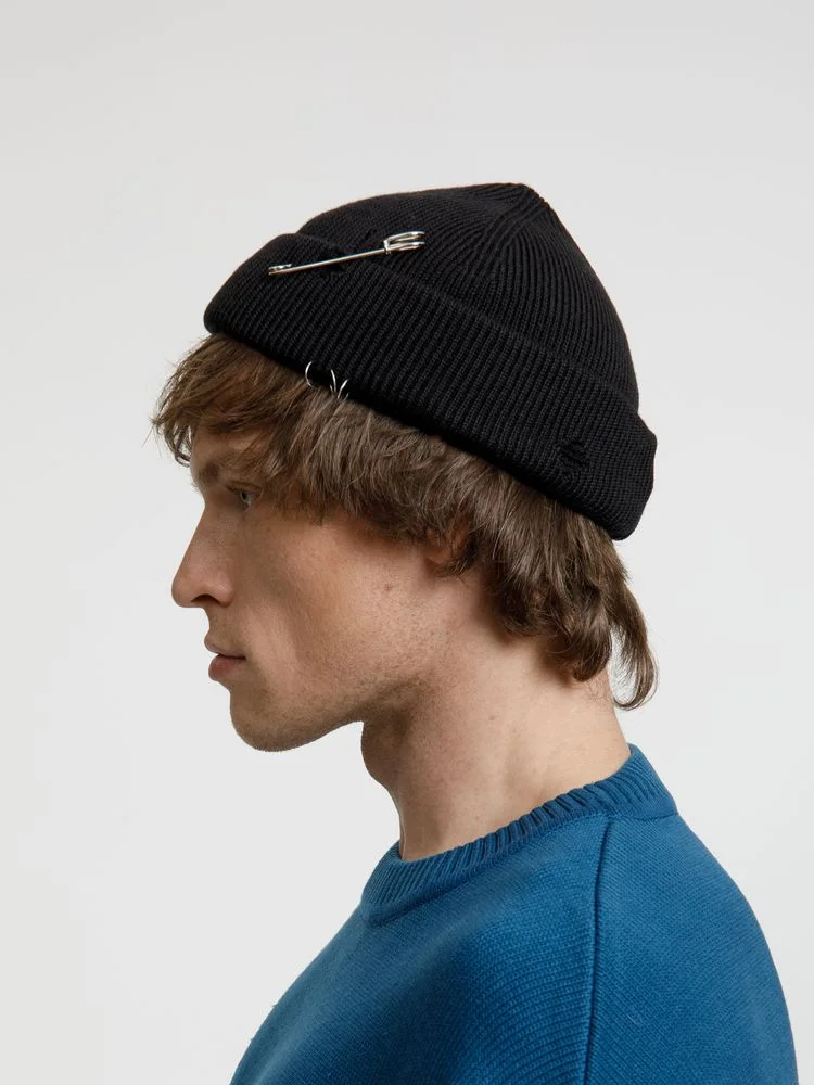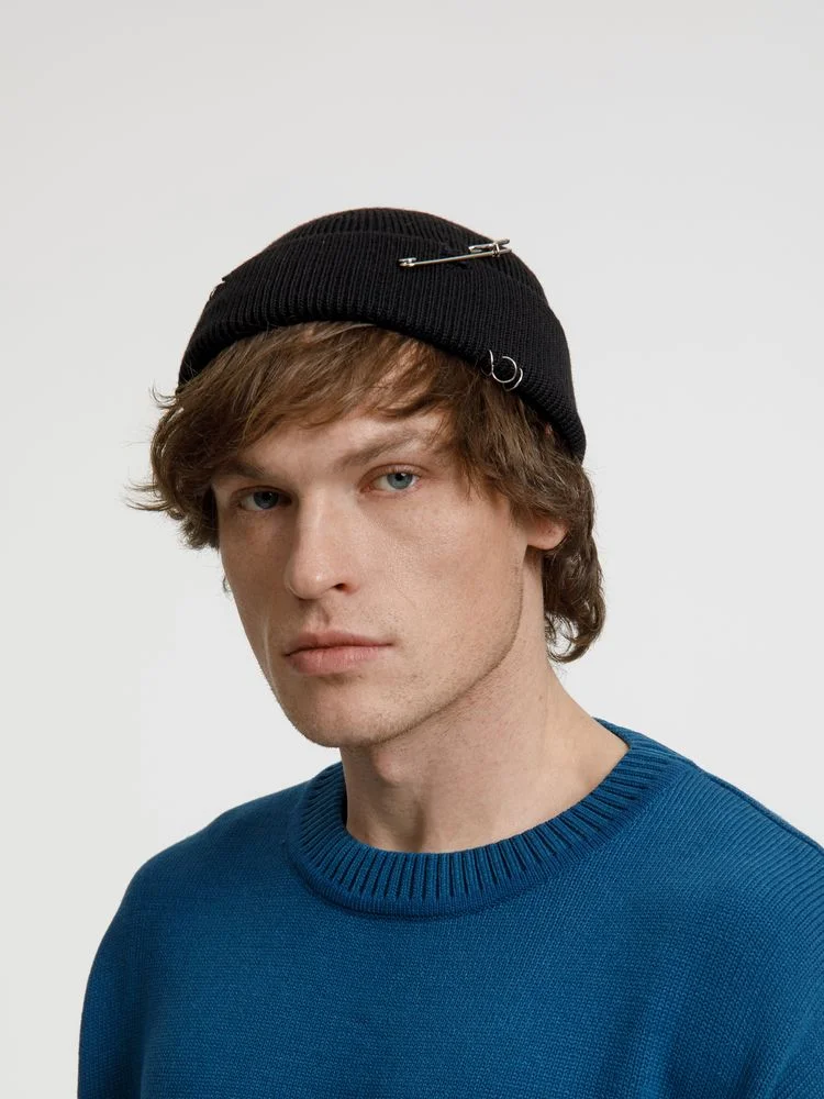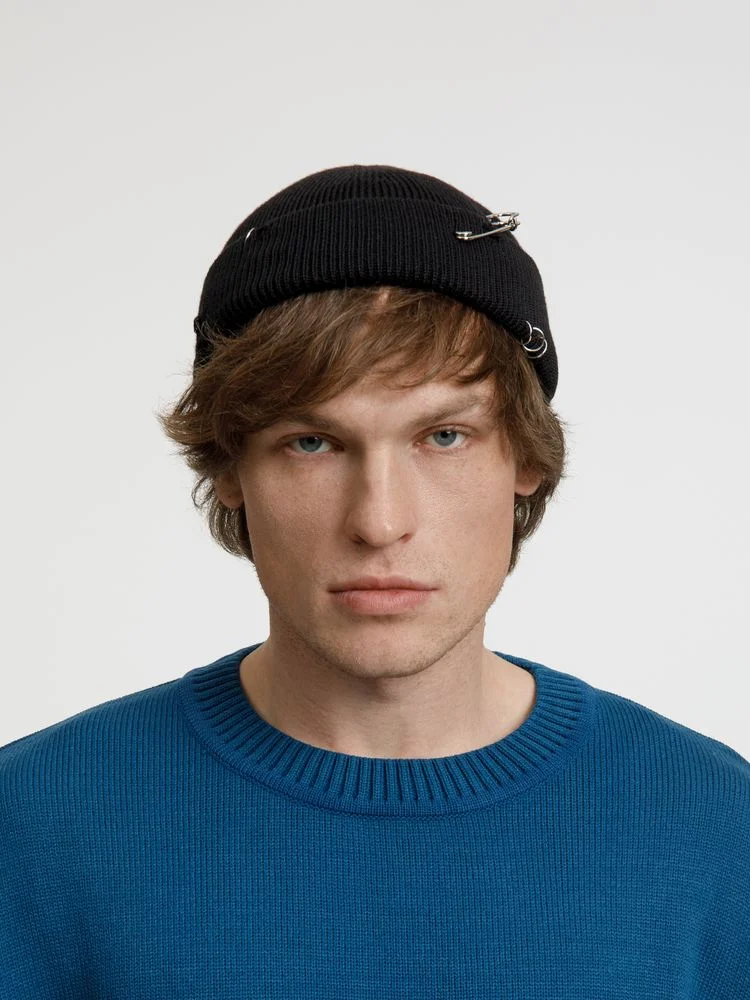 Однослойная шапка бини с рваным отворотом и металлическими аксессуарами станет ярким и запоминающимся акцентом в любом образе.