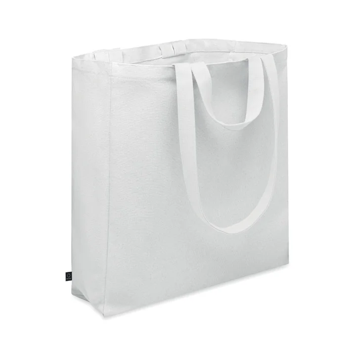 Recycled polycotton shopping or beach bag (70% recycled cotton, 30% recycled polyester) with short and long handles. It has a side zippered pocket. 380 gr/m².